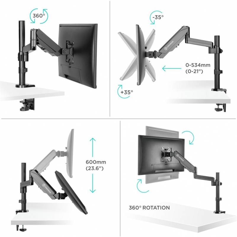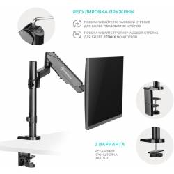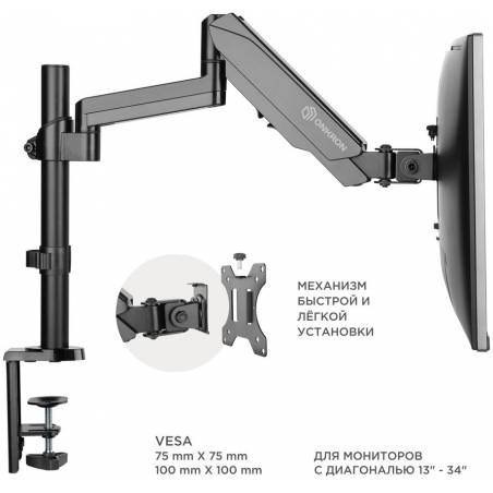 - "Настольный наклонно-поворотный кронштейн для монитора, выполненный по технологии газлифт, подходит для мониторов и телевизоров диагональю от 13 до 34 дюймов и весом от 1 до 8 кг."