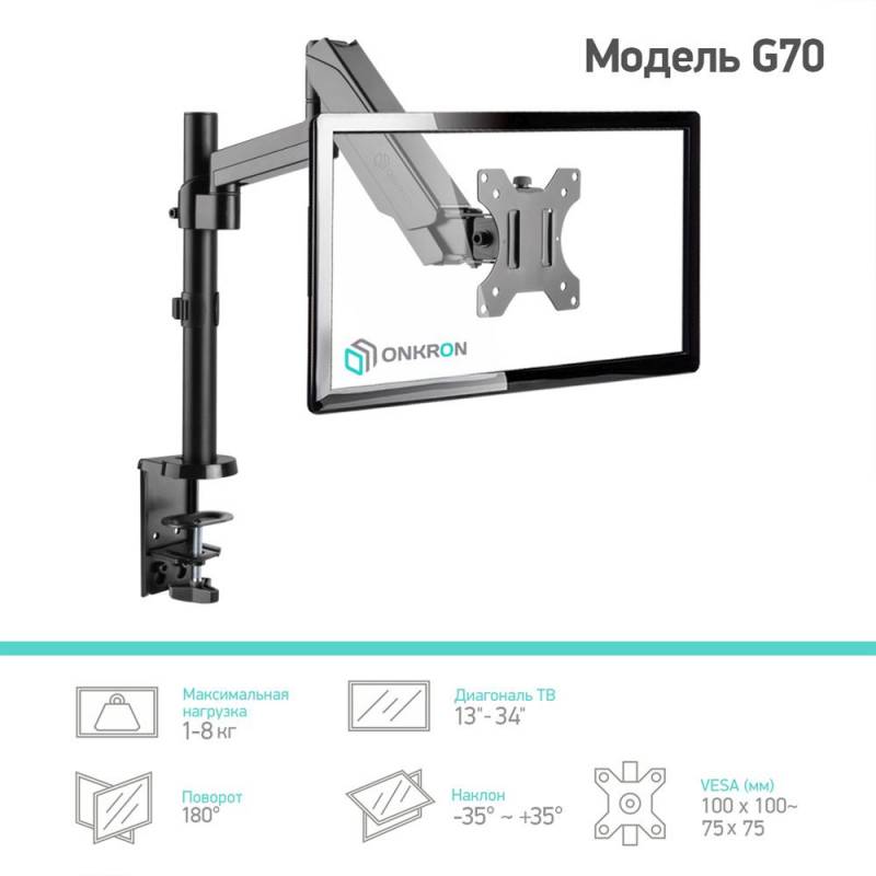 Кронштейн для мониторов Onkron G70 черный 13"-34" макс.8кг настольный поворот и наклон верт.перемещ.