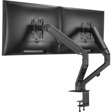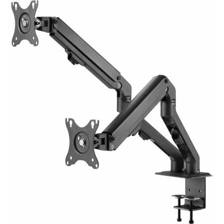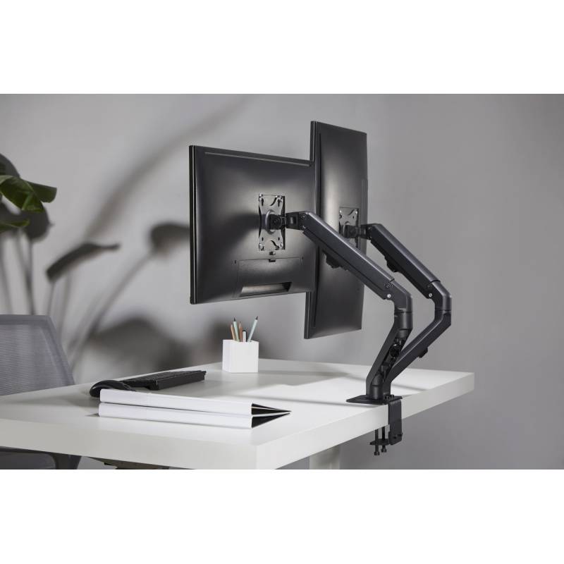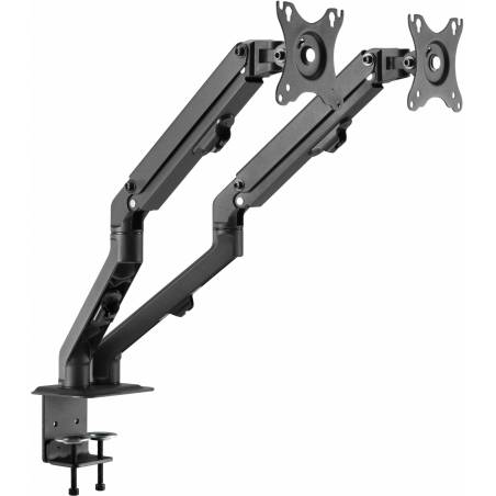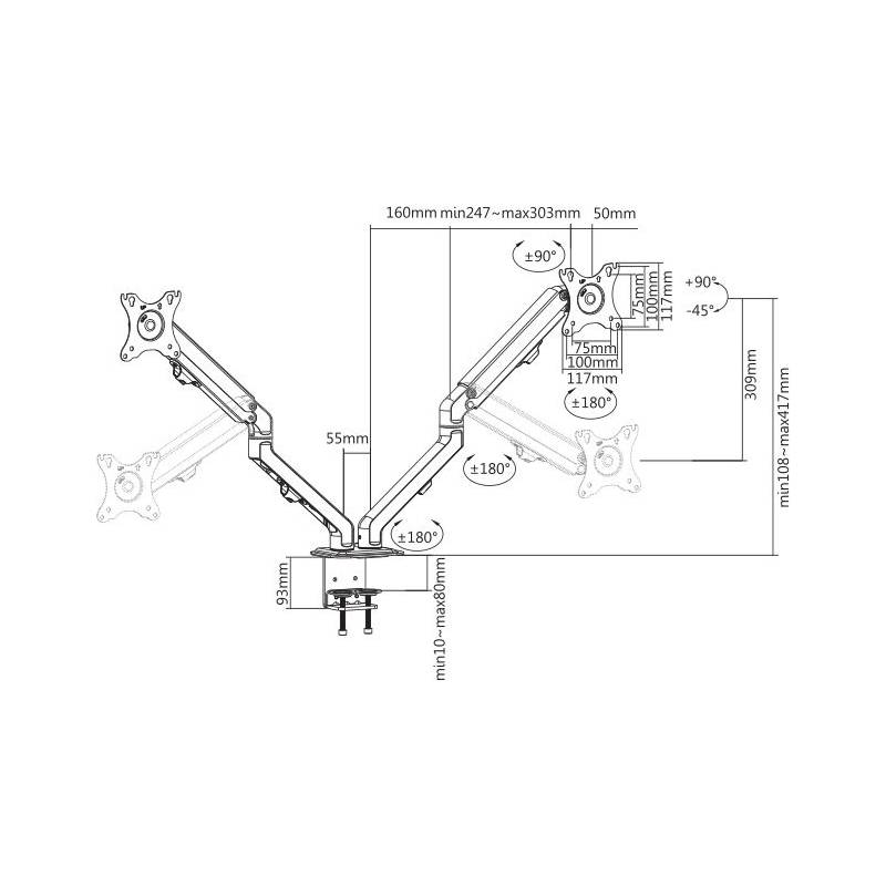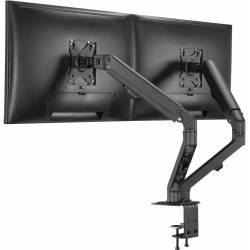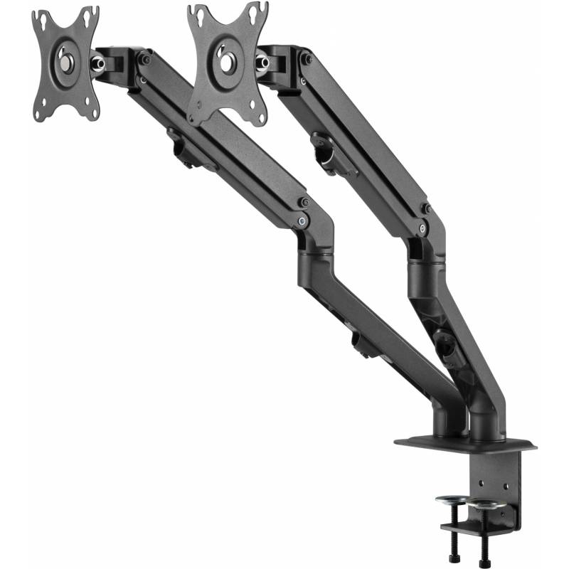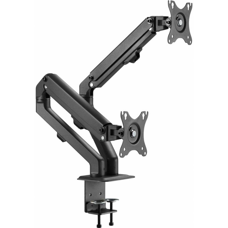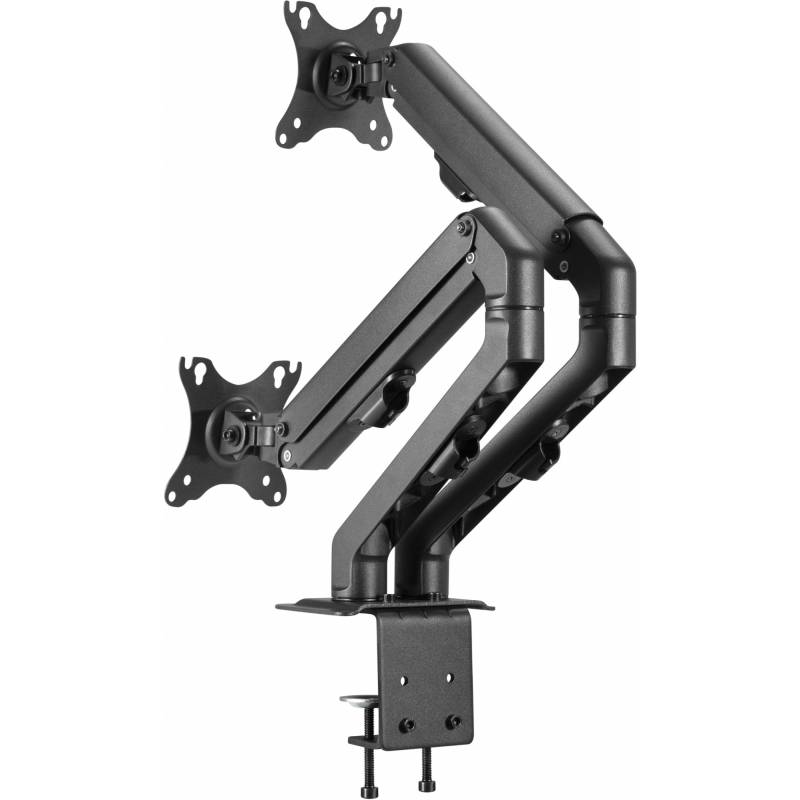 - Настольный кронштейн с двумя креплениями под мониторы. Пружинный механизм позволяет легко перемещаться вверх и вниз.