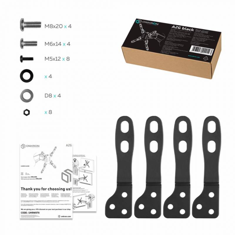 - Универсальный адаптер ONKRON A2G предназначен для установки мониторов с размерами монтажных отверстий 100х200, 200х100, 200х200 на любой кронштейн ONKRON с VESA-панелью, обладающей монтажными отверстиями 75х75 и 100х100 мм.