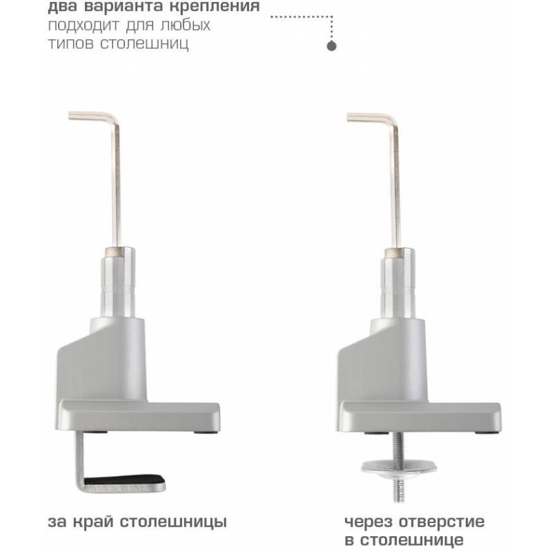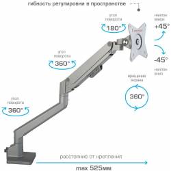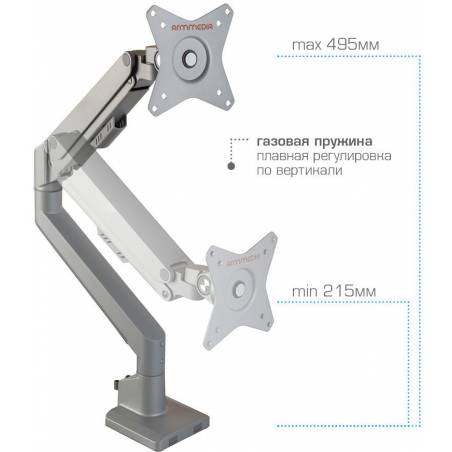 - Независимая регулировка каждого экрана - монитор можно поворачивать вокруг своей оси на 360°, наклонять вверх и вниз, придвигать или удалять от себя, Встроенная газовая пружина обеспечивает плавное и лёгкое движение экрана вверх и вниз, фиксацию в любом п