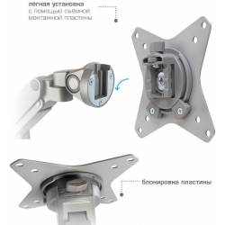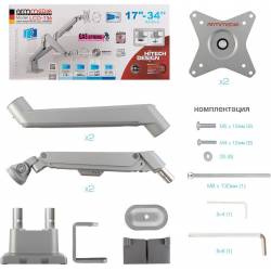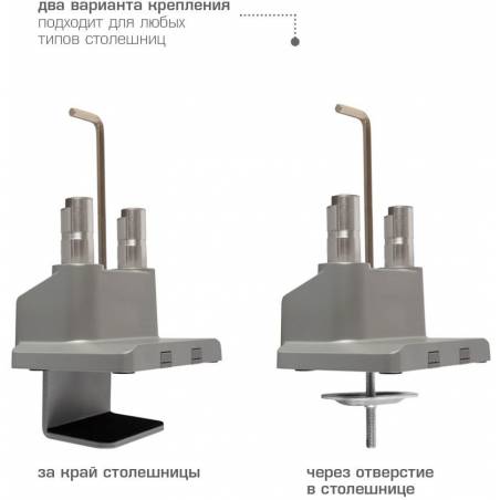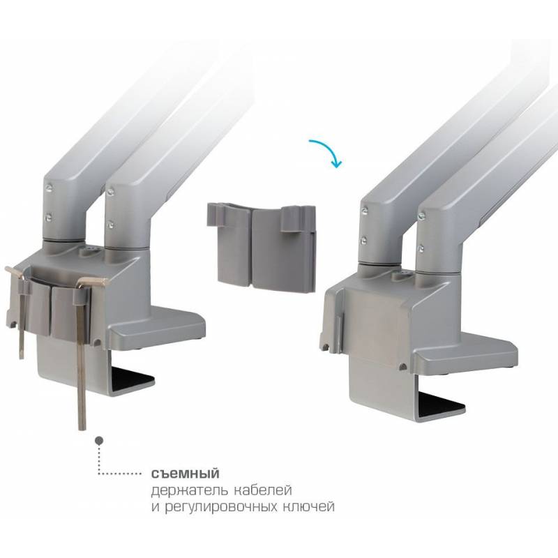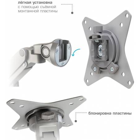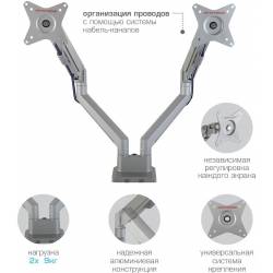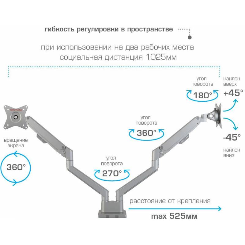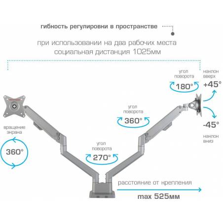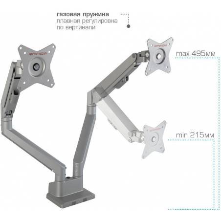 - Независимая регулировка каждого экрана - мониторы можно поворачивать вокруг своей оси на 360°, наклонять вверх и вниз, придвигать или удалять, Встроенная газовая пружина обеспечивает движение экрана вверх и вниз, фиксацию в любом промежуточном положении