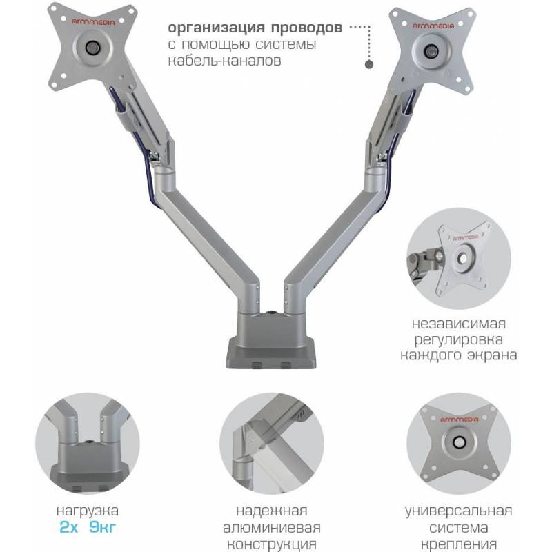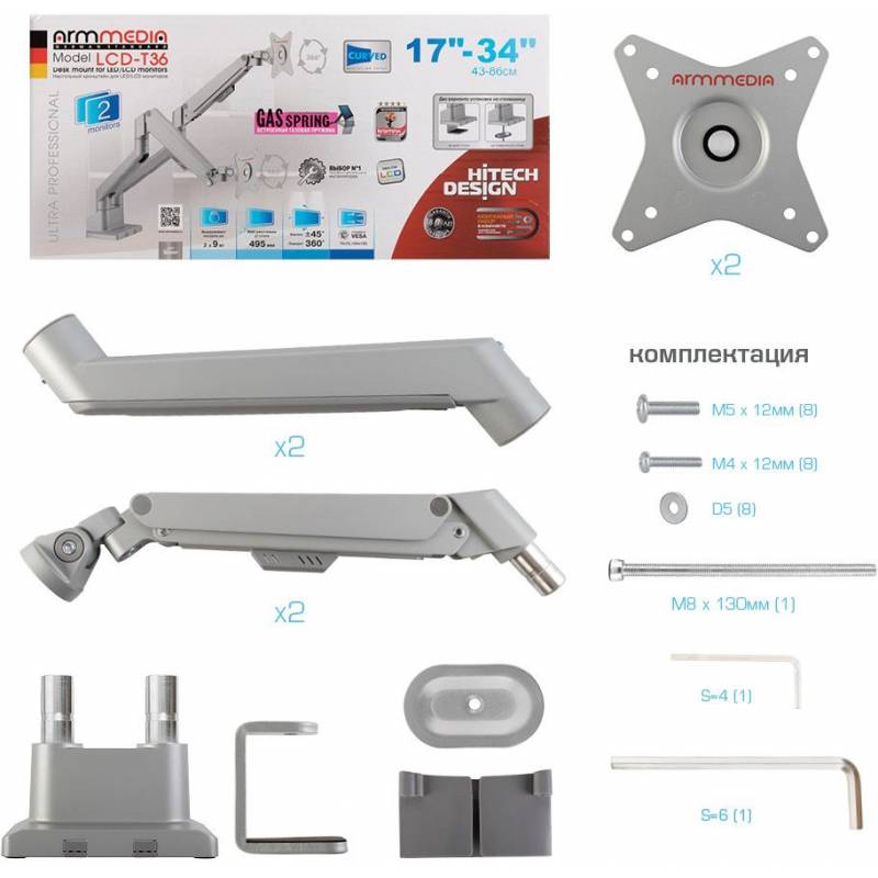 Кронштейн для мониторов Arm Media LCD-T36 серебристый 15"-34" макс.9кг настольный поворот и наклон верт.перемещ.