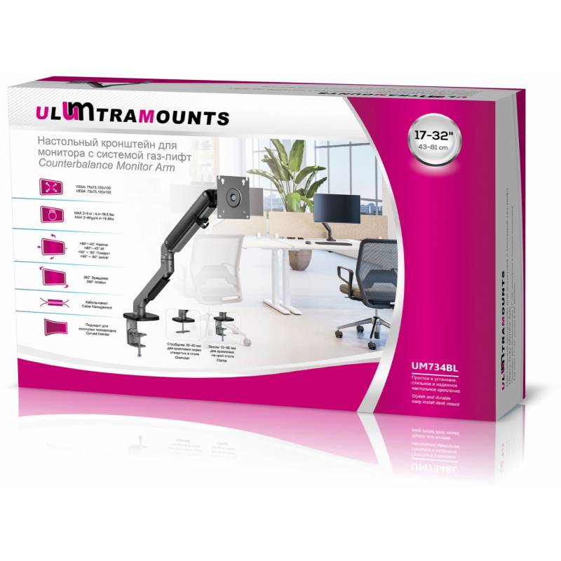 Кронштейн для мониторов Ultramounts UM734BL серый/черный 17"-27" макс.7кг крепление к столешнице поворот и наклон