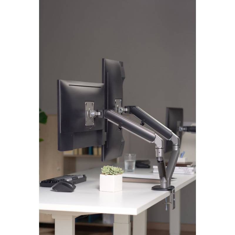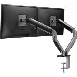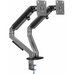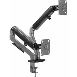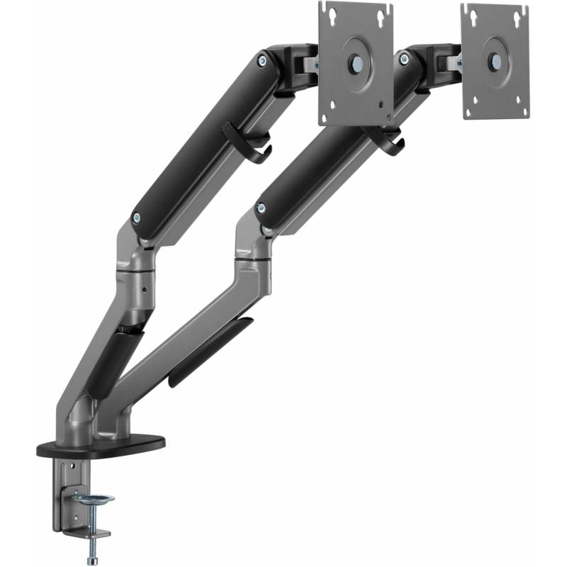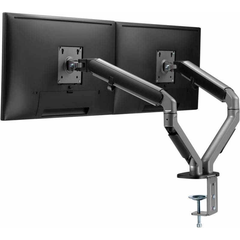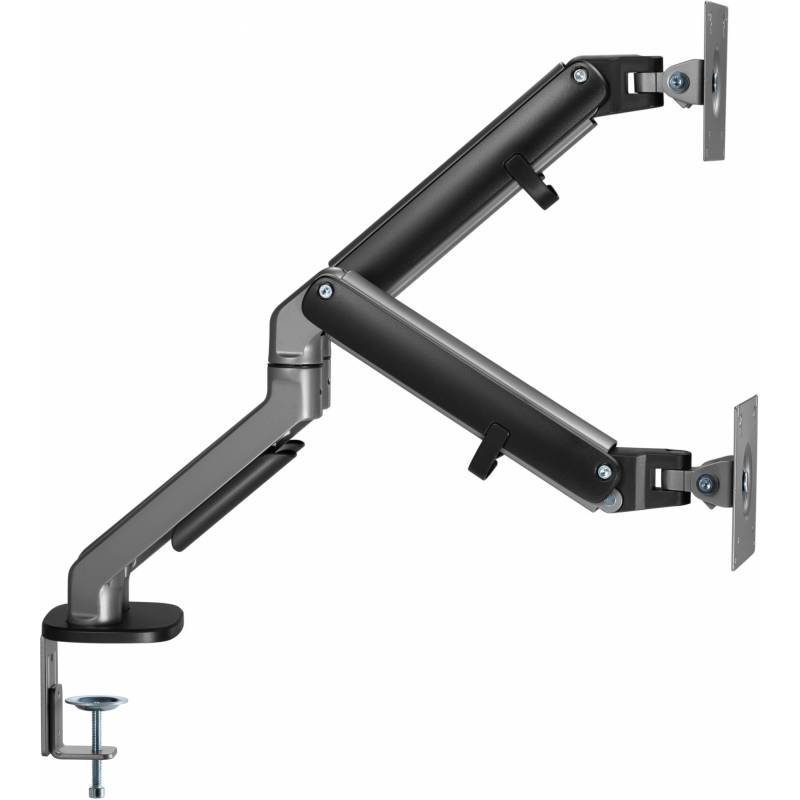 - Настольный кронштейн с двумя креплениями под мониторы. Встроенный пружинный механизм натяжения поможет для идеальной регулировки веса.