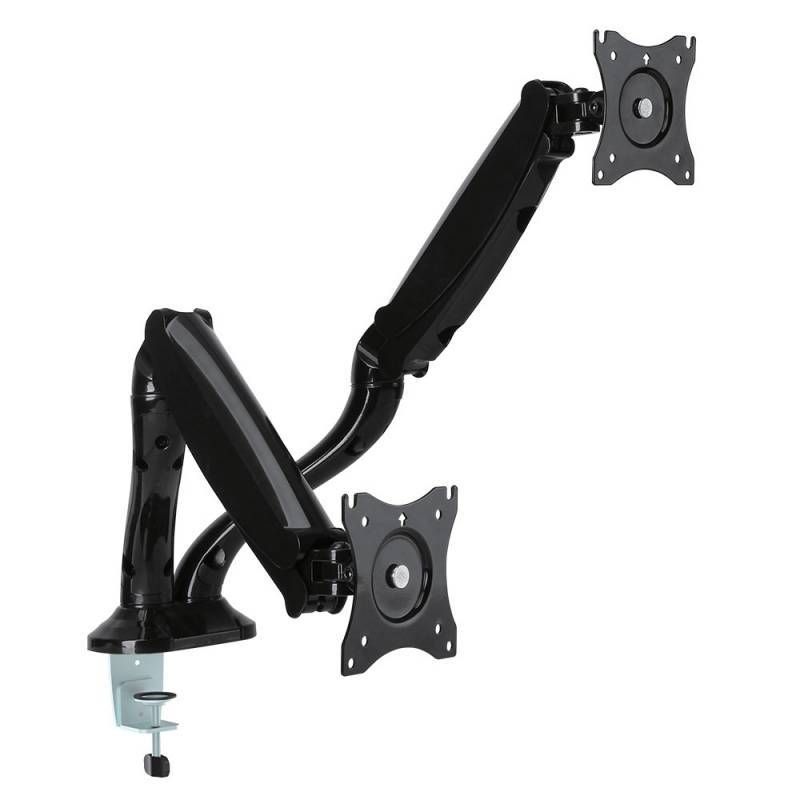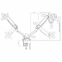 - Независимая регулировка каждого экрана - мониторы на кронштейнах можно поворачивать вокруг своей оси на 360°, наклонять вверх и вниз, придвигать или удалять от себя. Два варианта установки на столешницу: за край стола и на поверхность стола.