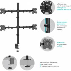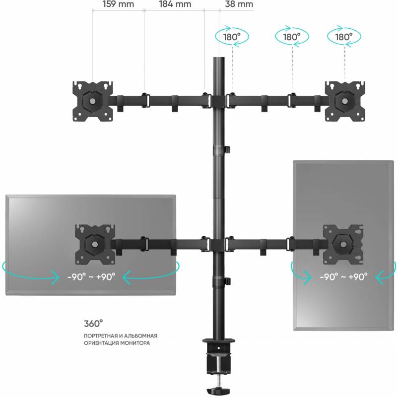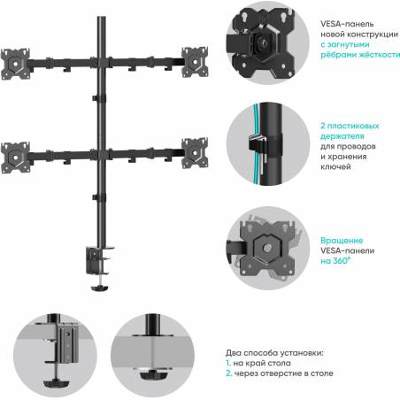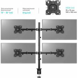 - Настольный кронштейн для четырех мониторов, ONKRON D421E подходит для мониторов и телевизоров диагональю от 13 до 32 дюймов и весом до 8 кг на каждый.