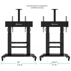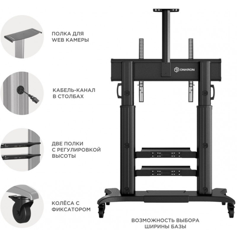- Раздвижное основание.Различные варианты крепления VESA. Инновационная конструкция. Встроенный кабель-канал .Полка для дополнительной техники. Надёжные колёса с системой фиксации.