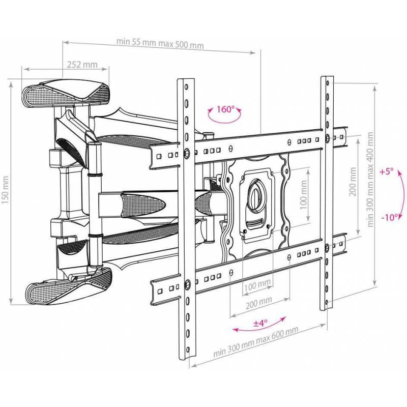 - Сверхмощная стальная конструкция. Универсальный - телевизор на кронштейне можно наклонить, повернуть и сдвинуть к стене. Легкий монтаж телевизора - благодаря наличию съемной монтажной пластины. Широкое настенное основание. Корректировка экрана ±4°. Кабель