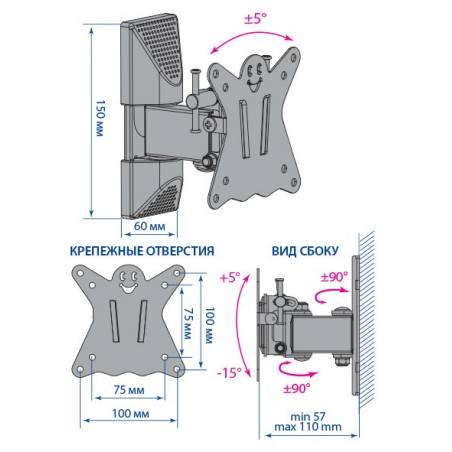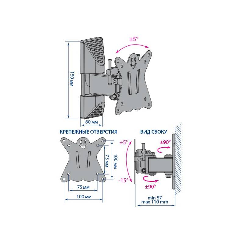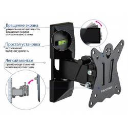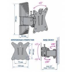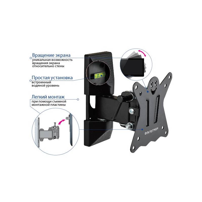 - Наклонно-поворотный кронштейн для крепления к стене телевизоров и мониторов с не большой диагональю экрана. Высококачественная стальная конструкция обеспечит надежное и безопасное использование. Легко снимающаяся монтажная пластина облегчит процесс уборки