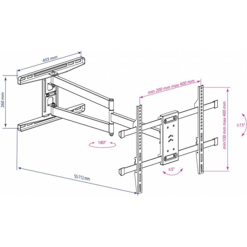 - Легкий монтаж при помощи съемной монтажной пластины. Мощная стальная конструкция. Универсальный телевизор на кронштейне можно наклонить, повернуть и сдвинуть к стене. Максимальный вылет от стены 712 мм. Корректировка экрана уникальная возможность вращения