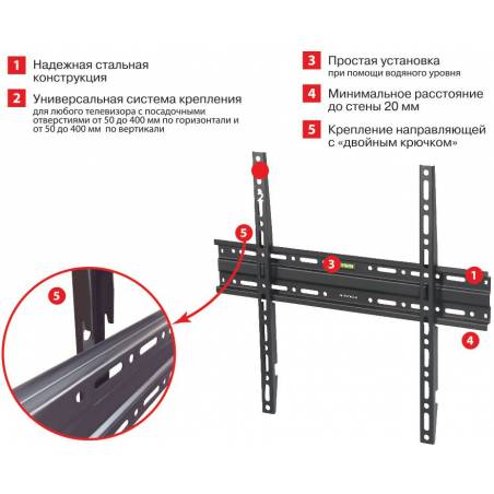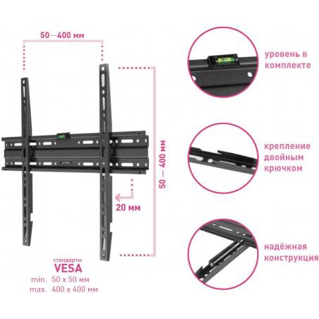 - Фиксированный кронштейн для телевизоров с диагональю 22-65 дюймов, весом до 55 кг. Расстояние от стены - 20 мм. Max VESA 400*400.
