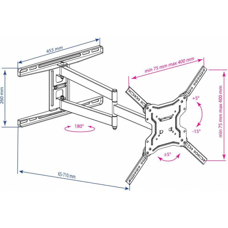 - Легкий монтаж при помощи съемной монтажной пластины. Мощная стальная конструкция. Универсальный - телевизор на кронштейне можно наклонить, повернуть и сдвинуть к стене. Максимальный вылет от стены 710 мм. Корректировка экрана уникальная возможность вращен
