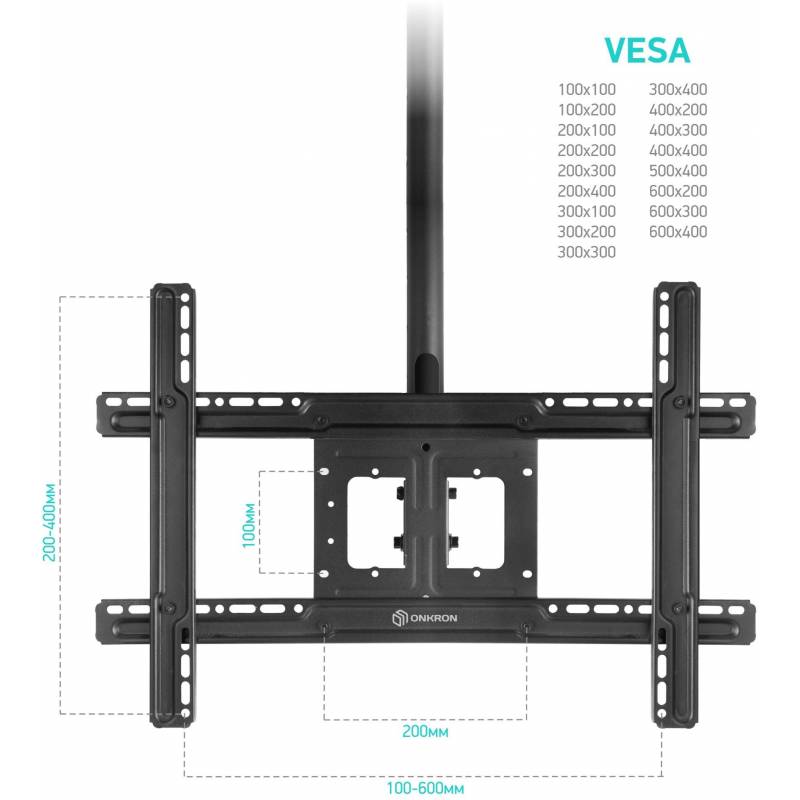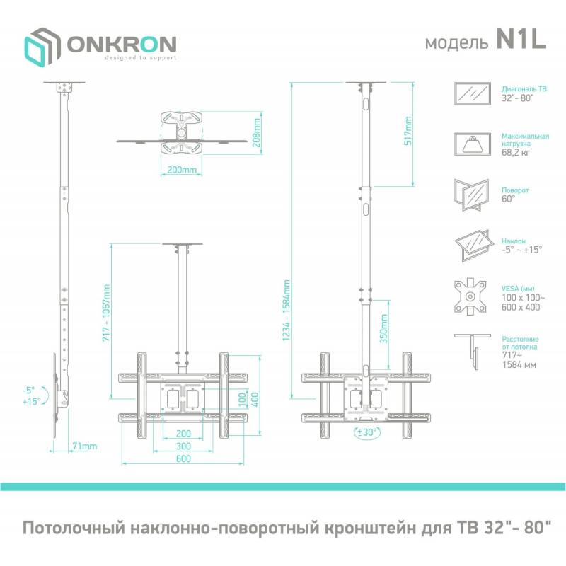 - Потолочный кронштейн для ТВ ONKRON N1L предназначен для панелей с диагональю экрана от 32 до 80 дюймов. Максимальный выдерживаемый вес составляет 68,2 кг, что делает кронштейн подходящим для средних и больших digital-панелей.