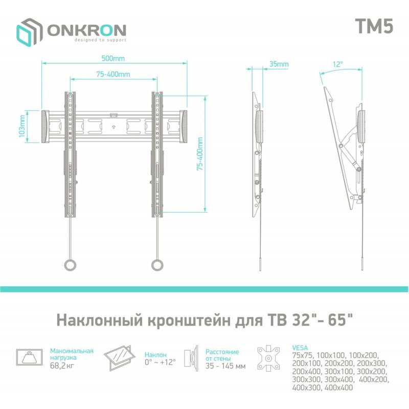 - Настенный кронштейн ONKRON TM5 предназначен для телевизоров с диагональю от 32 до 65 дюймов . Максимальный выдерживаемый вес составляет 68 кг.