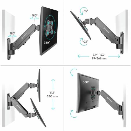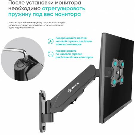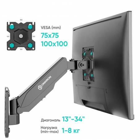 - Настенный наклонно-поворотный кронштейн для монитора, выполненный по технологии газлифт, ONKRON G120 подходит для мониторов и телевизоров диагональю от 13 до 34 дюймов и весом от 1 до 8 кг.