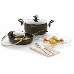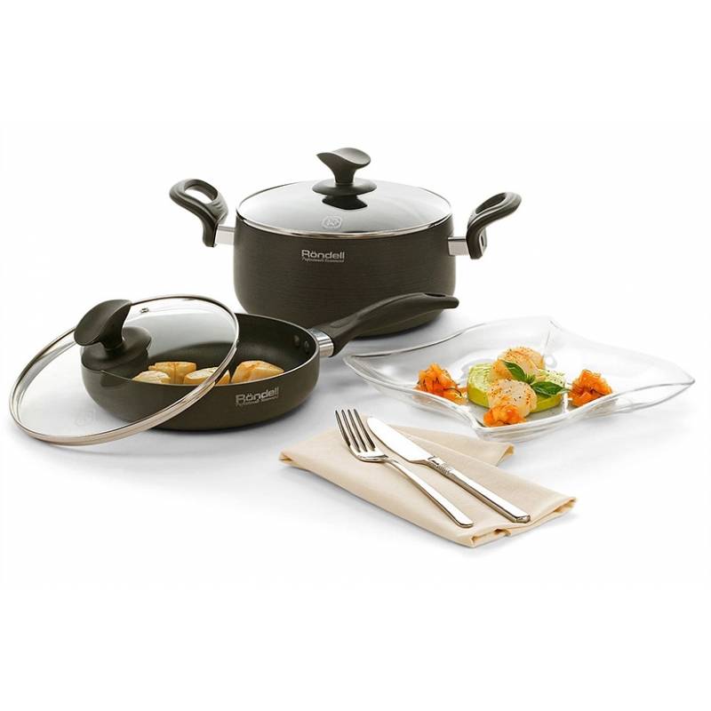 - Аксессуары: прочная бакелитовая ручка. Преимущества: металлический обод предотвращает сколы и трещины; отверстие для выпуска пара; специальное углубление в ручке для размещения аксессуара (лопатки/половника/ложки) во время готовки. Упаковка: к