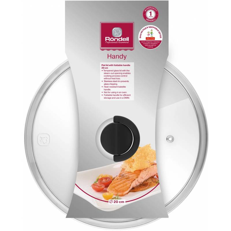 - Преимущества: металлический обод предотвращает сколы и трещины на стекле; отверстие для выпуска пара позволяет контролировать процесс приготовления без потери тепла; прочная ручка из нержавеющей стали; плоская форма крышки – экономия пространства при