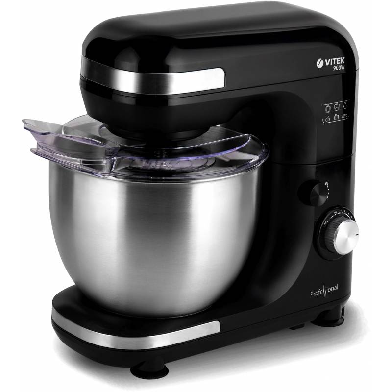- Справиться практически с любой кулинарной задачей способна кухонная машина VITEK VT-1431 с максимальной мощностью 900 Вт. В комплект с прибором входят три основные насадки, предназначенные для смешивания, взбивания и замешивания теста.