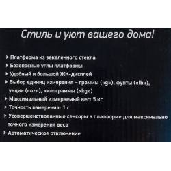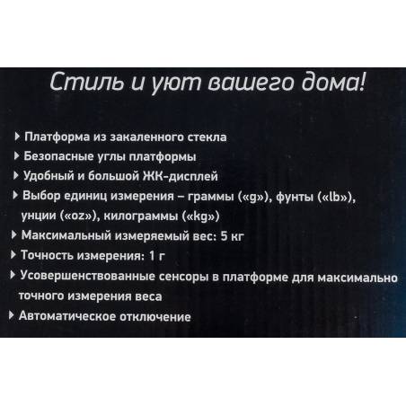 - ЖК-дисплей, единицы измерения на выбор: граммы («g»), унции («oz»), фунты («lb») и килограммы («kg»). Прорезиненные ножки, покрытие от отпечатков пальцев.