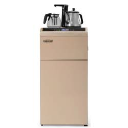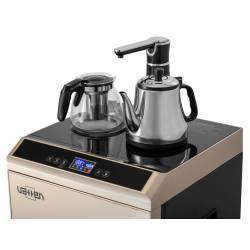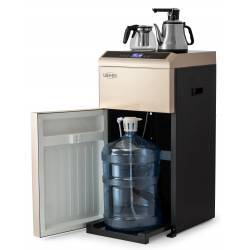 - Техническая новинка кулера с нижней загрузкой бутыли - кулер сделанный по схеме tea bar (чайный столик - тиабар). Подача воды осуществляется через кран, установленный в верхней части аппарата.Кулер оснащен двумя чайниками: для заварки чая и для кипяче