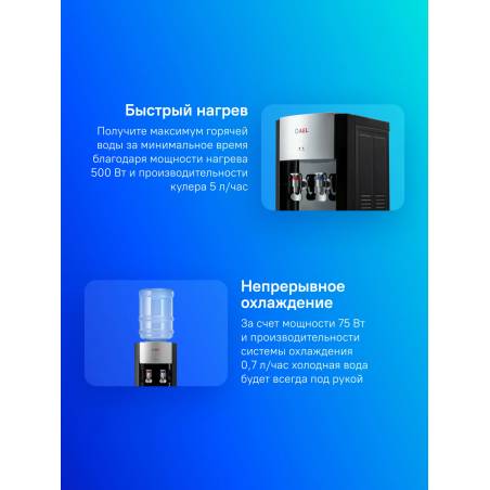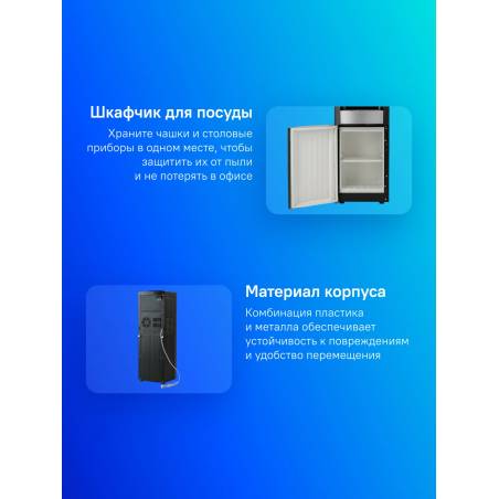 - Бюджетный кулер с верхней загрузкой электронного охлаждения со шкафчиком 10л. Краники нажим чашкой с внутренней резьбой. Цвет черный с серебряными вставками. Боковые стенки выполнены из металла, окрашенные в черный цвет.