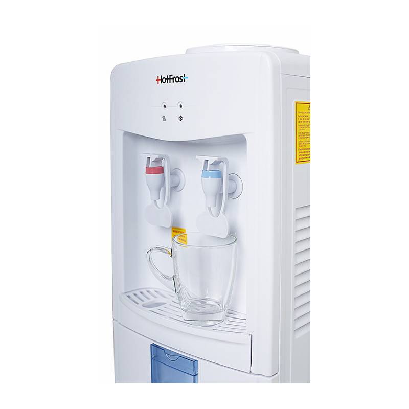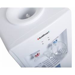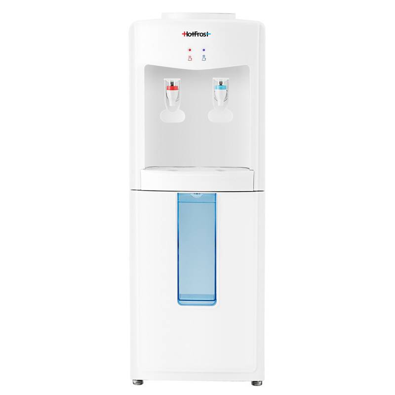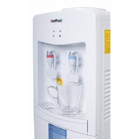 - HotFrost V118E - недорогой, но в то же время надежный кулер для воды. Наличие нажимных краников избавляет владельцев данной модели от излишних контактов с поверхностями кулера, что действительно очень гигиенично. Кроме этого, кулер оборудован откидным шка