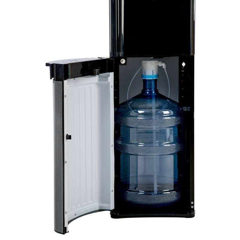 - Дизайн с элементами нержавейки позволяет кулеру вписаться как в любой офис или приемную, так и в обычную квартиру или помещения в стиле лофт. Основной особенностью этого кулера, конечно, является шкафчик для бутыли с водой.
