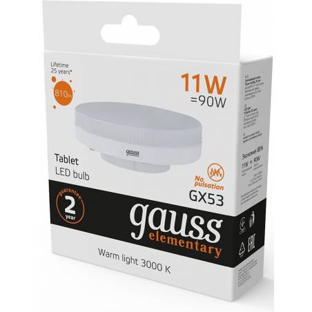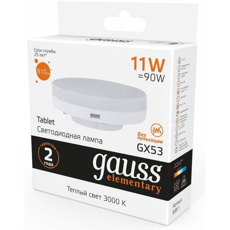 Лампа светодиодная Gauss Elementary GX53 11Вт цок.:GX53 таблетка 220B 3000K св.свеч.бел.теп. Tablet (упак.:1шт) (83811)