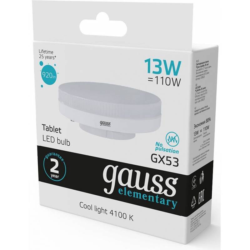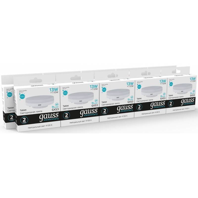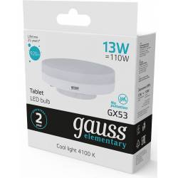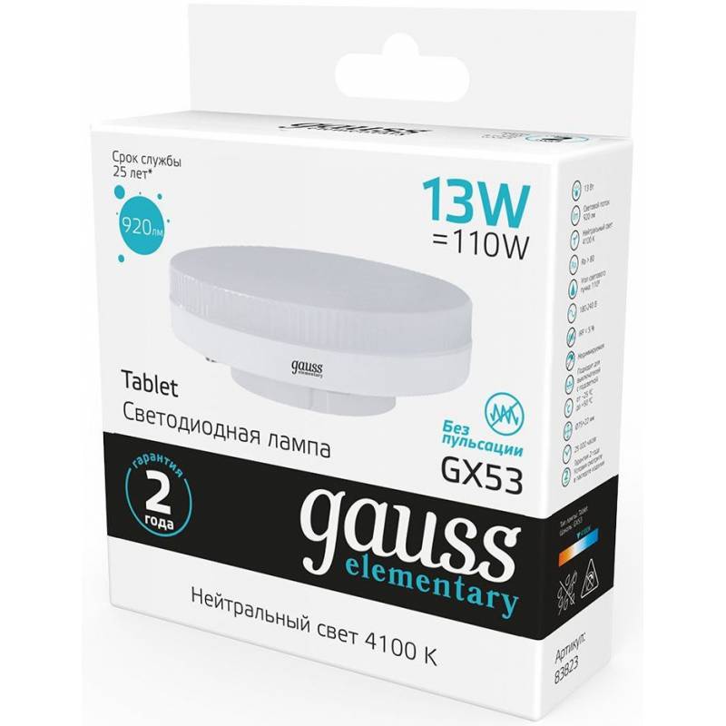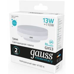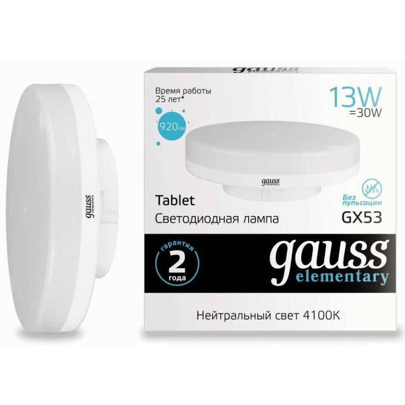 Лампа светодиодная Gauss Elementary GX53 13Вт цок.:GX53 таблетка 220B 4100K св.свеч.бел.нейт. Tablet (упак.:1шт) (83823)