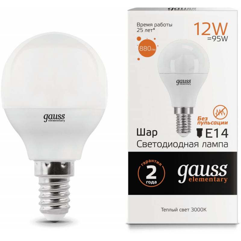 Лампа светодиодная Gauss Globe Elementary 12Вт цок.:E14 шар 220B 3000K св.свеч.бел.теп. P45 (упак.:1шт) (53112)