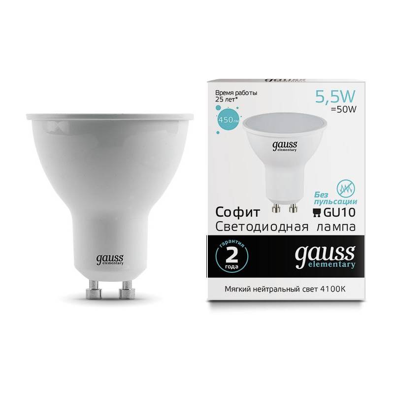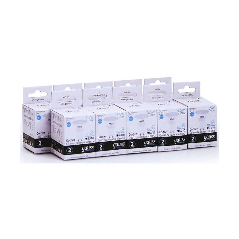 Лампа светодиодная Gauss Elementary MR16 5.5Вт цок.:GU10 спот 220B 4100K св.свеч.бел.нейт. (упак.:10шт) (13626)