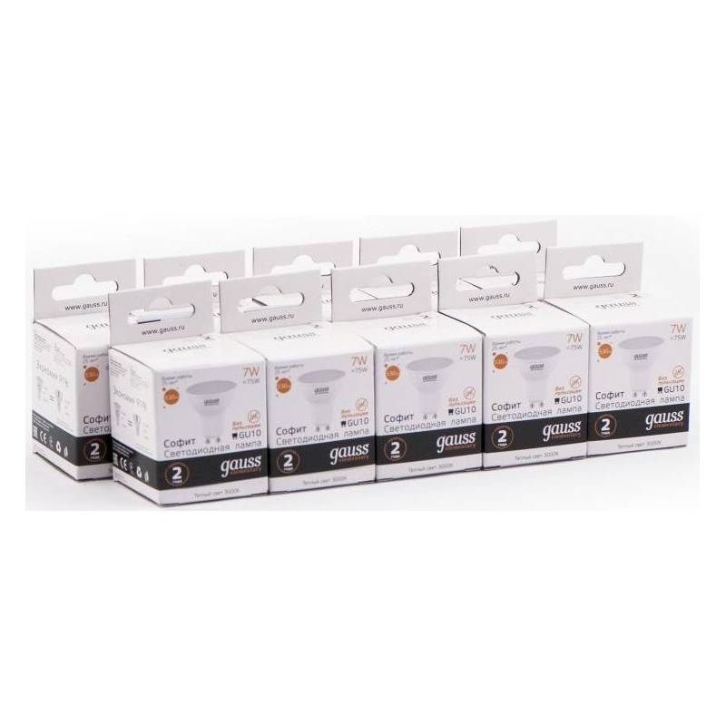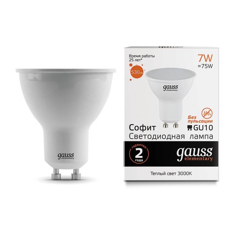 Лампа светодиодная Gauss Elementary MR16 7Вт цок.:GU10 спот 220B 3000K св.свеч.бел.теп. (упак.:10шт) (13617)
