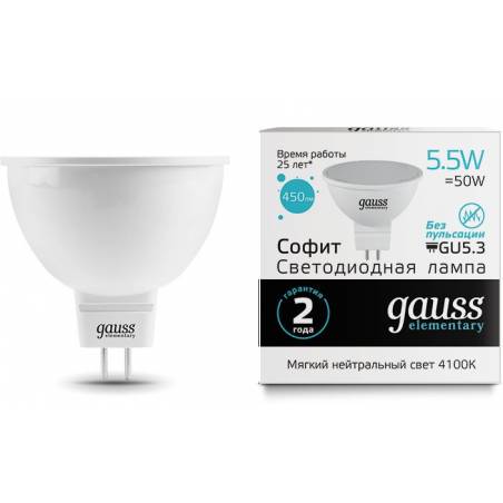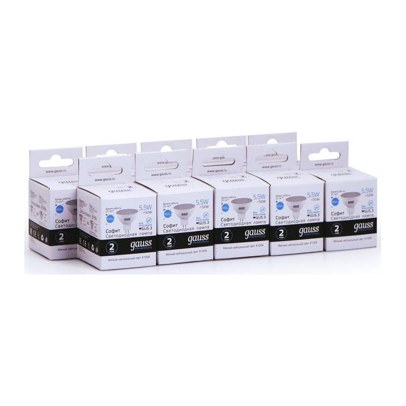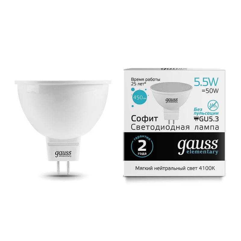 Лампа светодиодная Gauss Elementary MR16 5.5Вт цок.:GU5.3 спот 220B 4100K св.свеч.бел.нейт. (упак.:10шт) (13526)