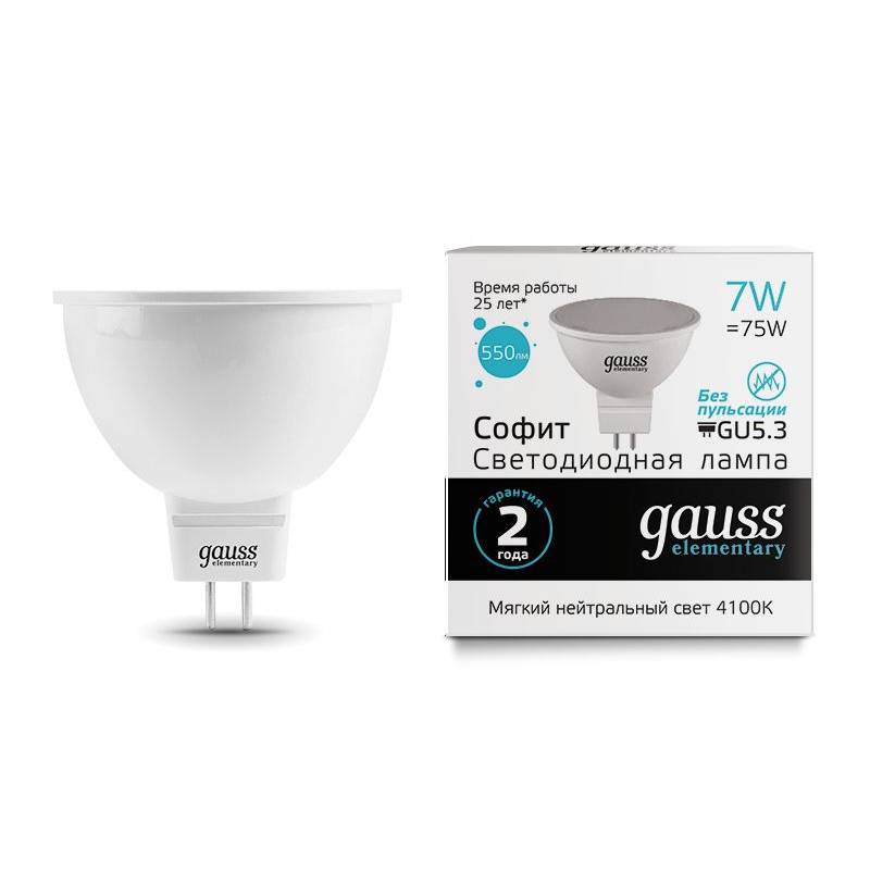 Лампа светодиодная Gauss Elementary MR16 7Вт цок.:GU5.3 спот 220B 4100K св.свеч.бел.нейт. MR16 (упак.:10шт) (13527)