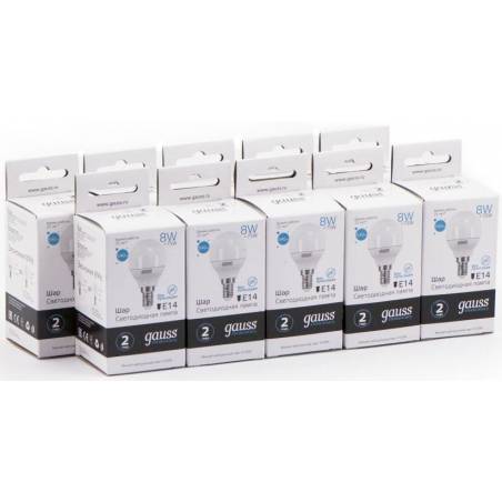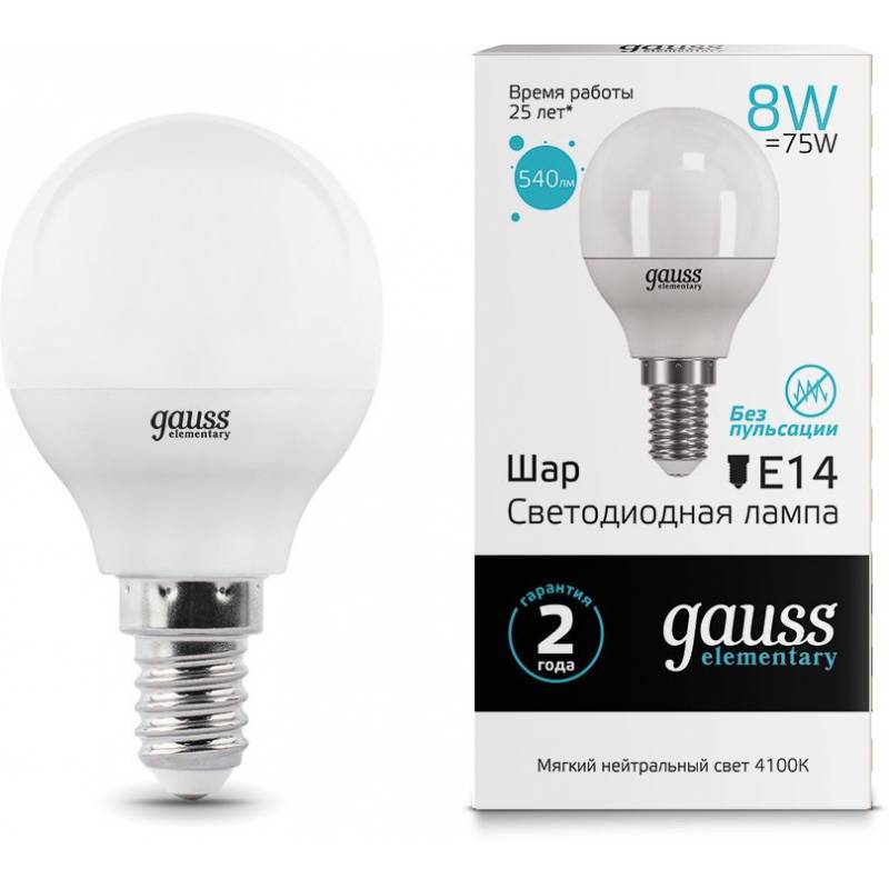 Лампа светодиодная Gauss Elementary 8Вт цок.:E14 шар 220B 4100K св.свеч.бел.нейт. P45 (упак.:10шт) (53128)