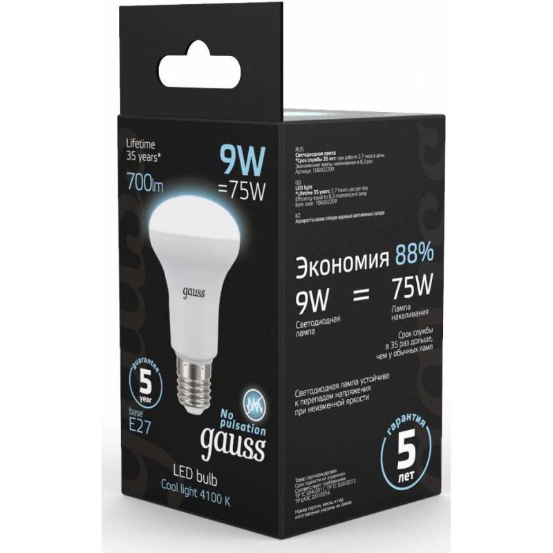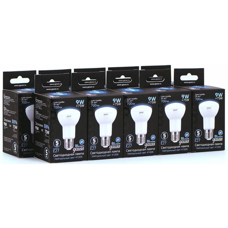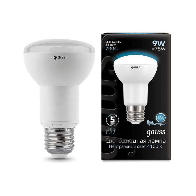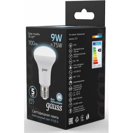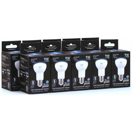 Лампа светодиодная Gauss R63 9Вт цок.:E27 рефлек. 220B 4100K св.свеч.бел.нейт. (упак.:10шт) (106002209)