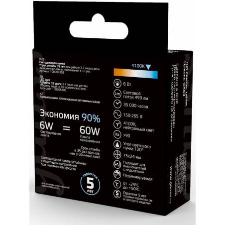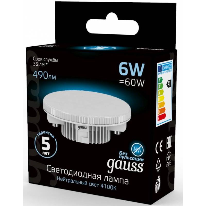 Лампа светодиодная Gauss GX53 6Вт цок.:GX53 таблетка 220B 4100K св.свеч.бел.нейт. (упак.:10шт) (108008206)