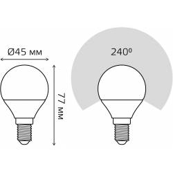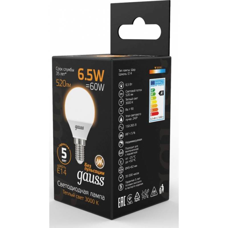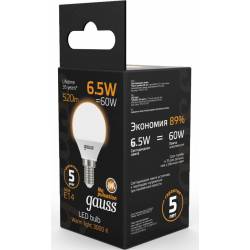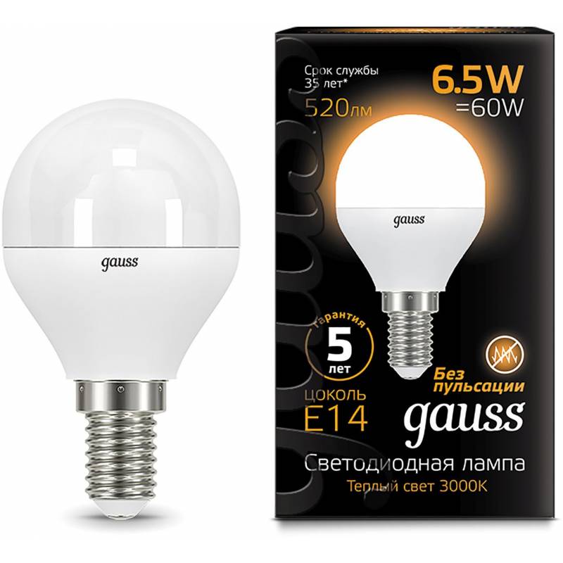 Лампа светодиодная Gauss 6.5Вт цок.:E14 шар 220B 3000K св.свеч.бел.теп. (упак.:1шт) (105101107)