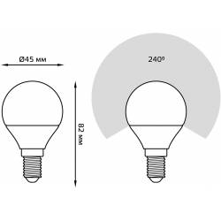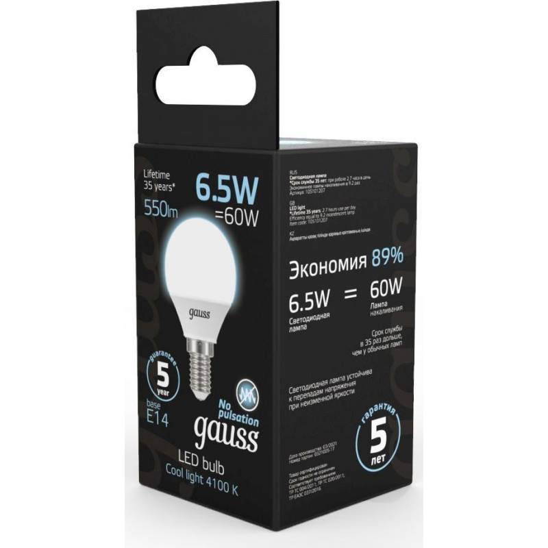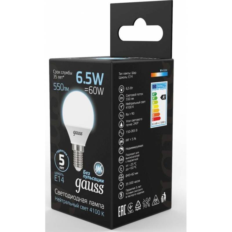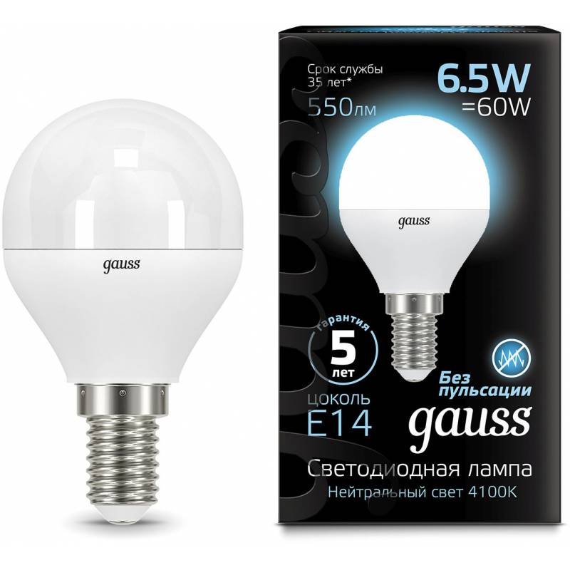Лампа светодиодная Gauss 6.5Вт цок.:E14 шар 220B 4100K св.свеч.бел.нейт. (упак.:10шт) (105101207)