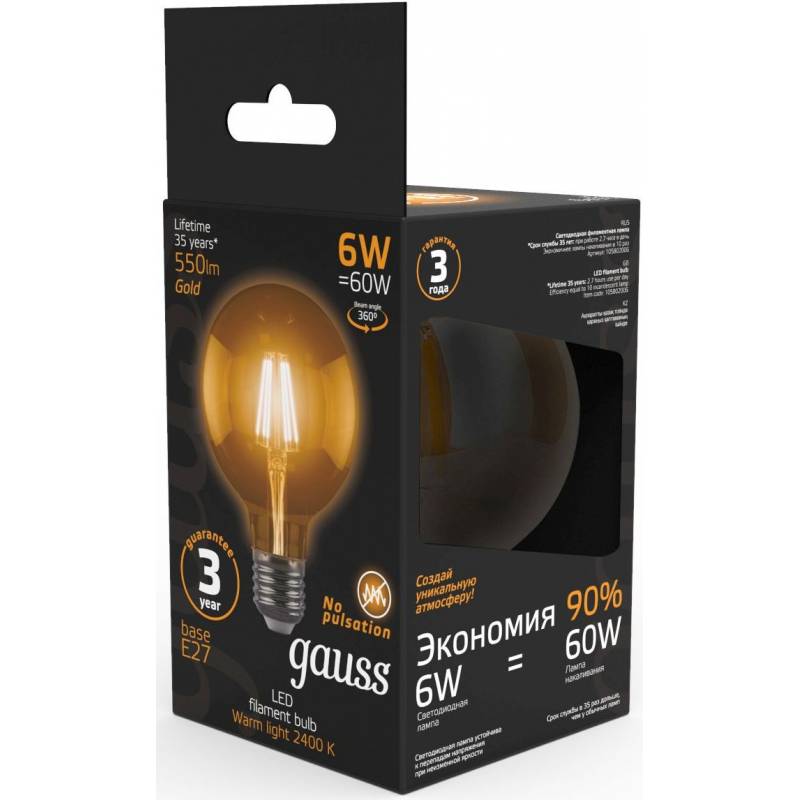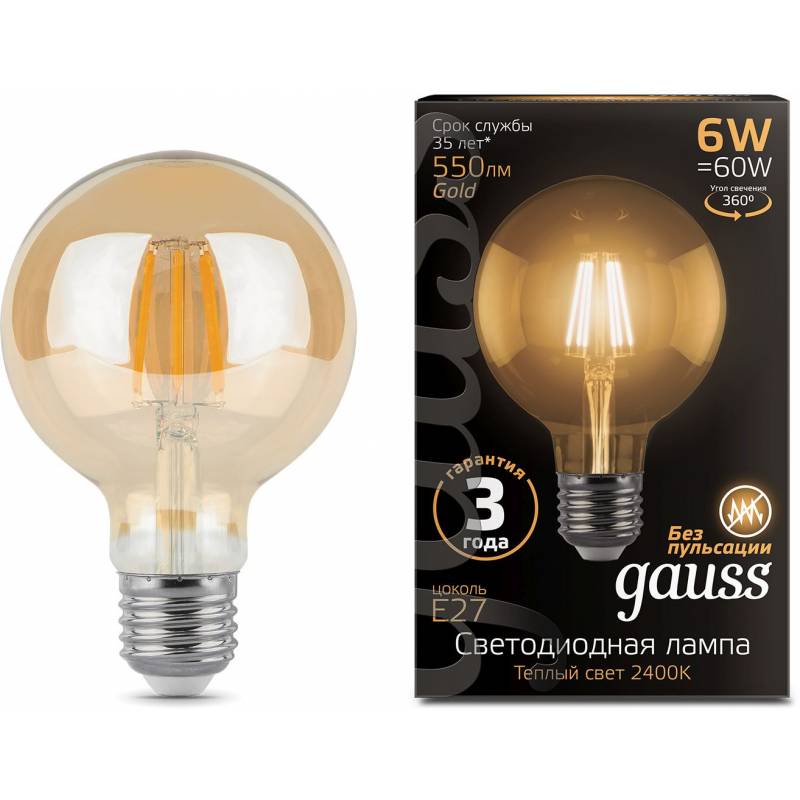 Лампа светодиодная Gauss Filament G95 6Вт цок.:E27 шар 220B 2400K св.свеч.бел.теп. (упак.:1шт) (105802006)