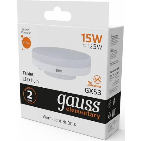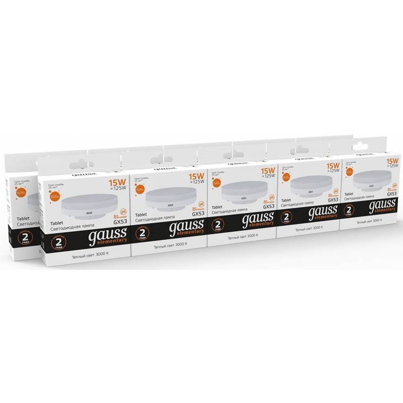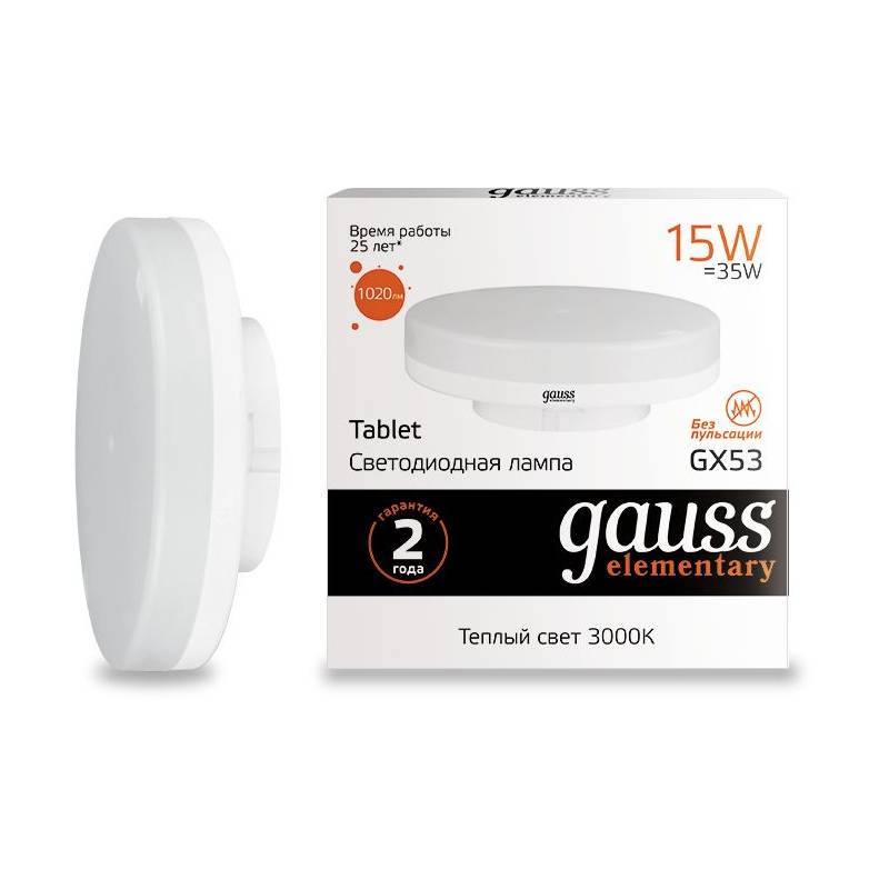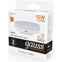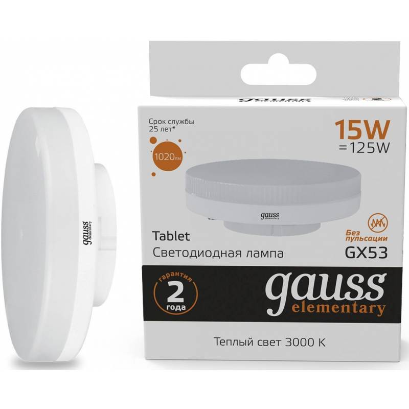 Лампа светодиодная Gauss Elementary GX53 15Вт цок.:GX53 таблетка 220B 3000K св.свеч.бел.теп. (упак.:1шт) (83815)