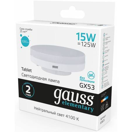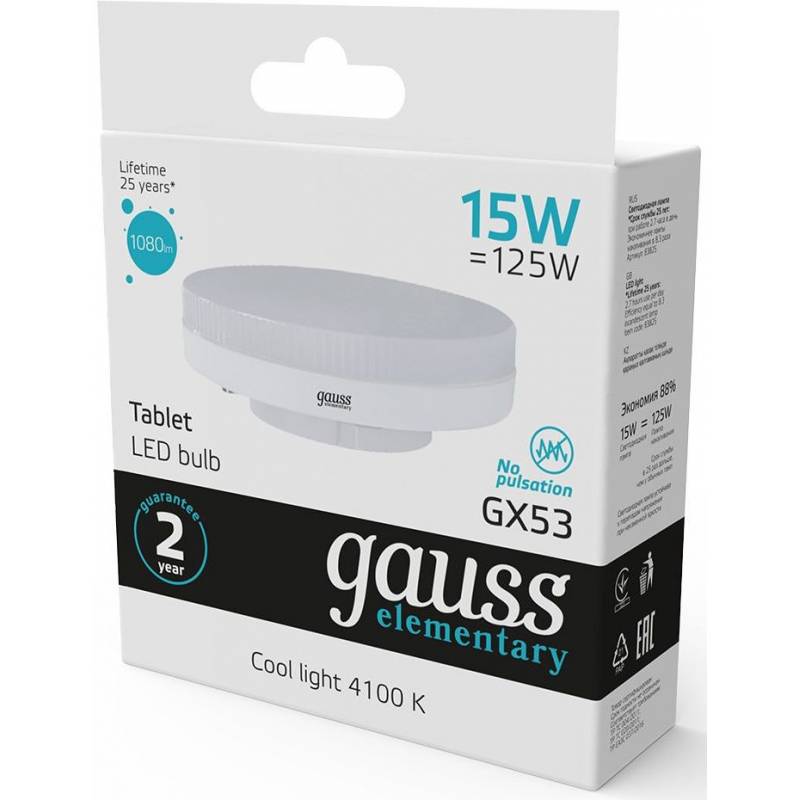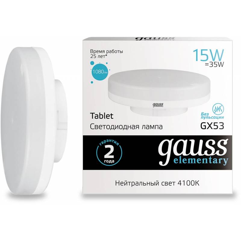 Лампа светодиодная Gauss Elementary GX53 15Вт цок.:GX53 таблетка 220B 4100K св.свеч.бел.нейт. (упак.:10шт) (83825)