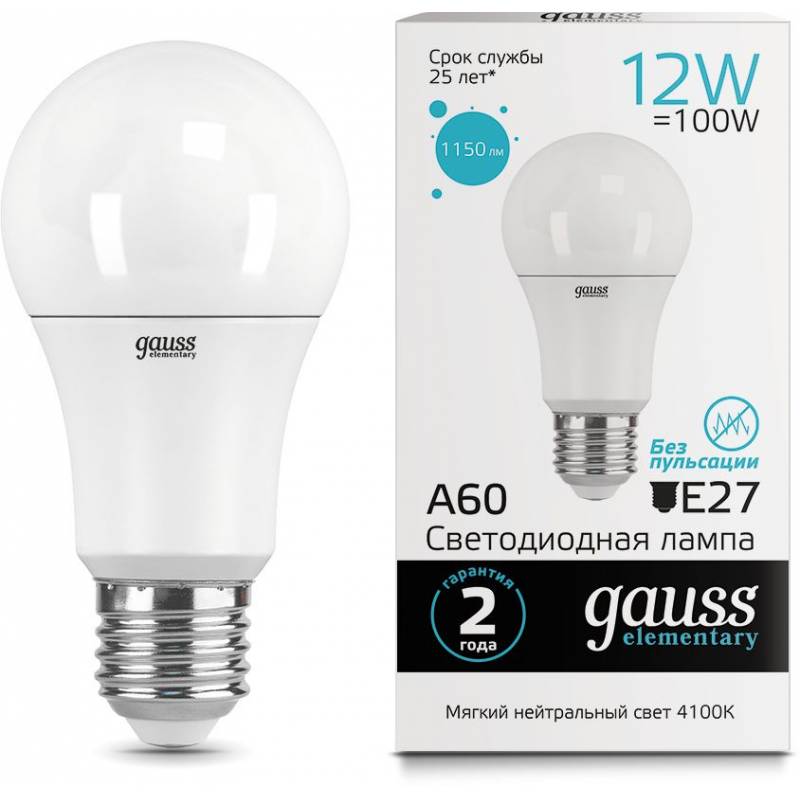 Лампа светодиодная Gauss Elementary A60 12Вт цок.:E27 груша 220B 4100K св.свеч.бел.нейт. (упак.:1шт) (23222)