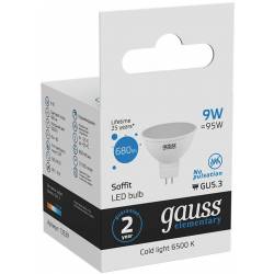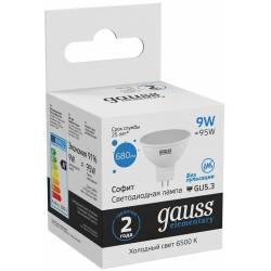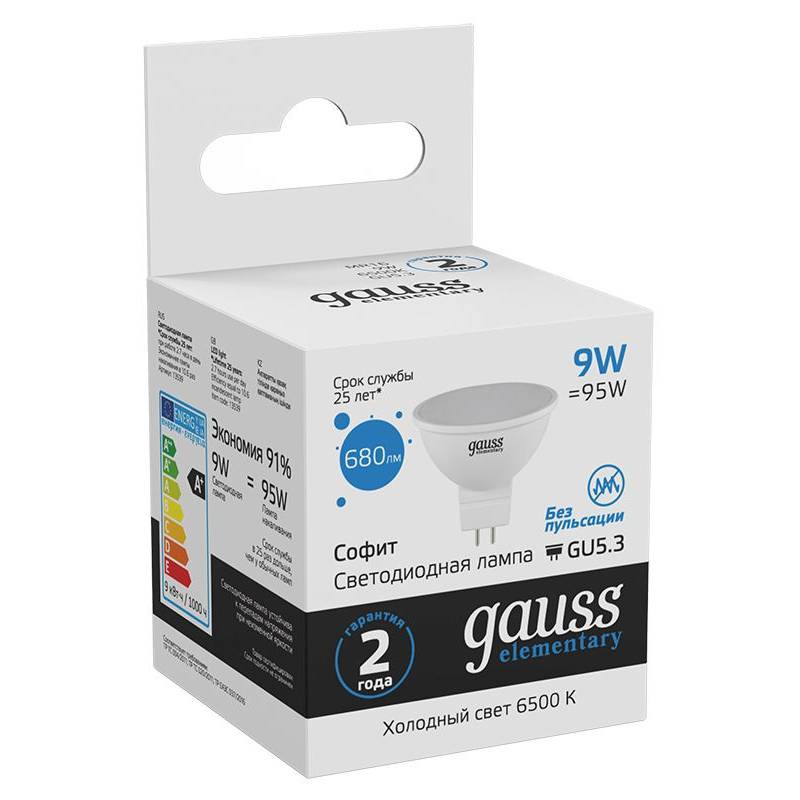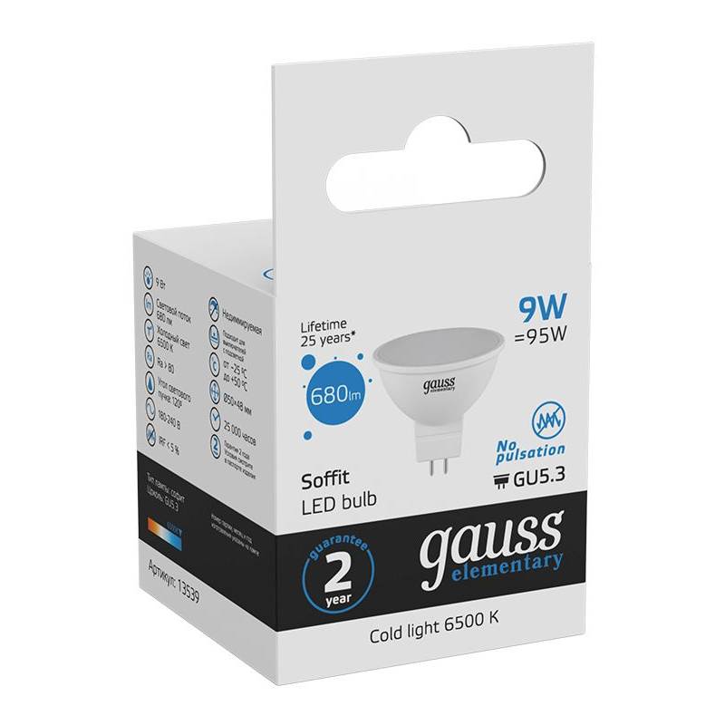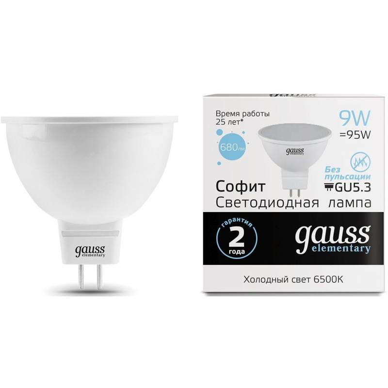 Лампа светодиодная Gauss Elementary MR16 9Вт цок.:GX5.3 спот 220B 6500K св.свеч.бел.хол. MR16 (упак.:10шт) (13539)