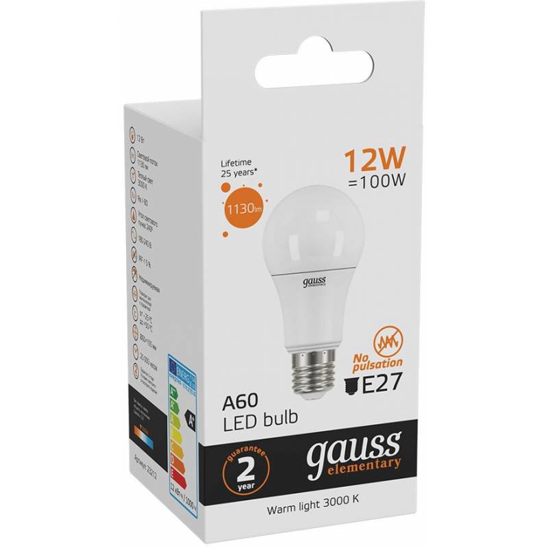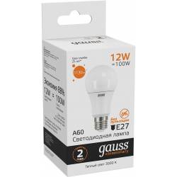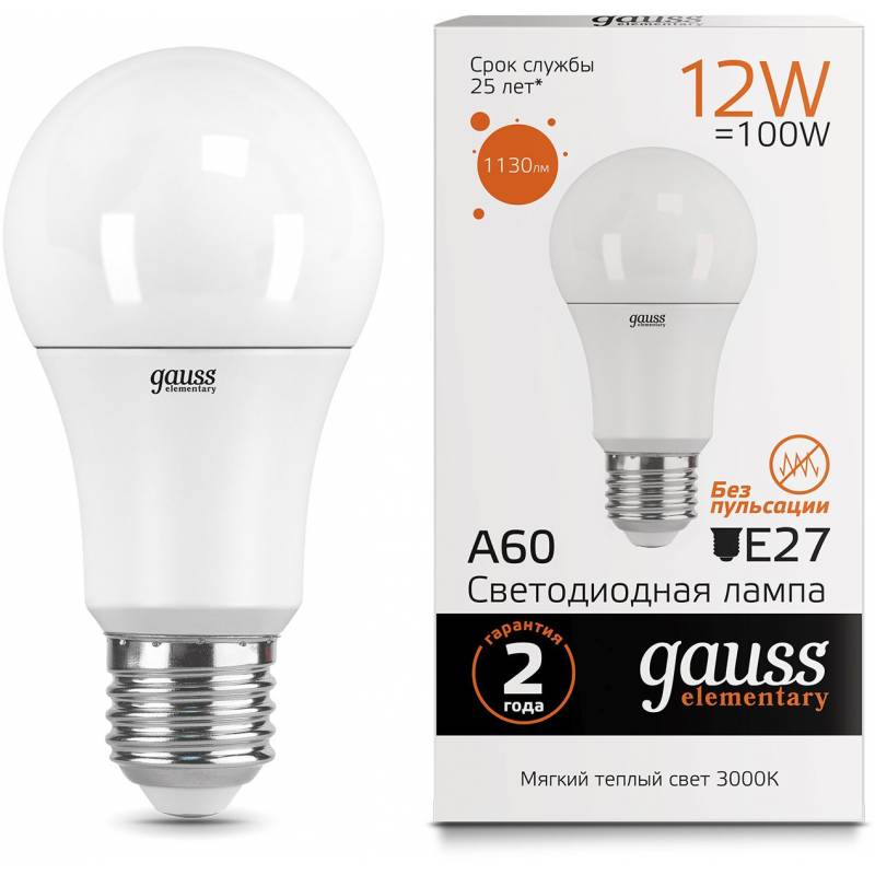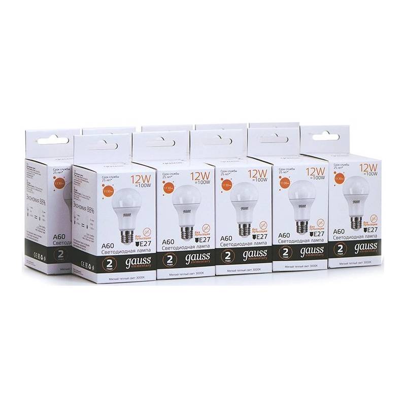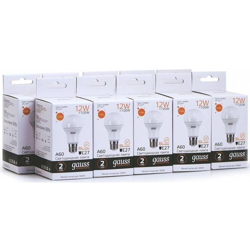 Лампа светодиодная Gauss Elementary 12Вт цок.:E27 груша 220B 3000K св.свеч.бел.теп. A60 (упак.:10шт) (23212)