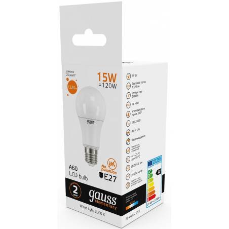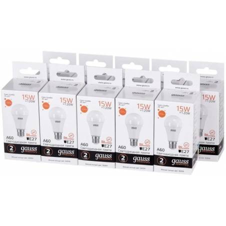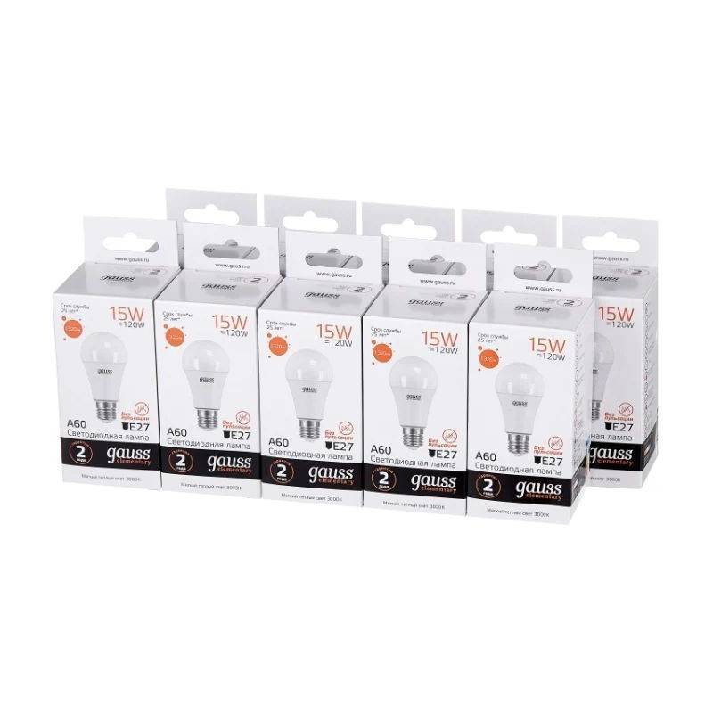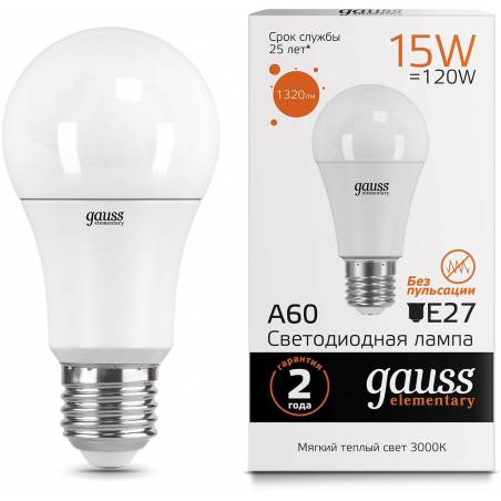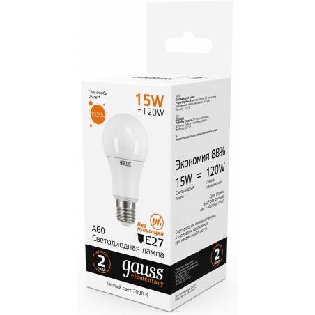 Лампа светодиодная Gauss Elementary 15Вт цок.:E27 груша 220B 3000K св.свеч.бел.теп. A60 (упак.:10шт) (23215)