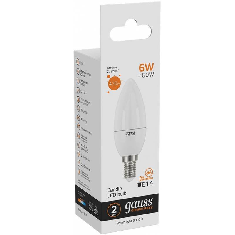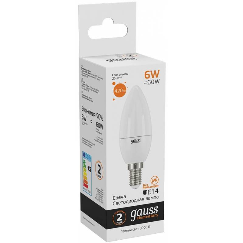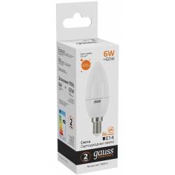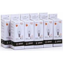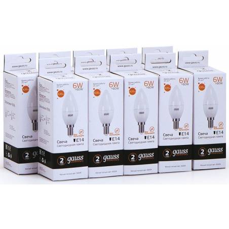 Лампа светодиодная Gauss Elementary 6Вт цок.:E14 свеча 220B 3000K св.свеч.бел.теп. C37 (упак.:10шт) (33116)