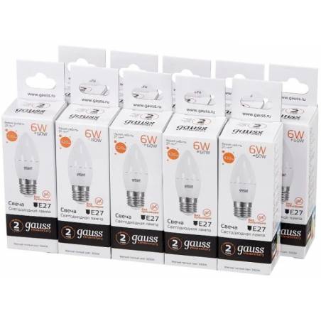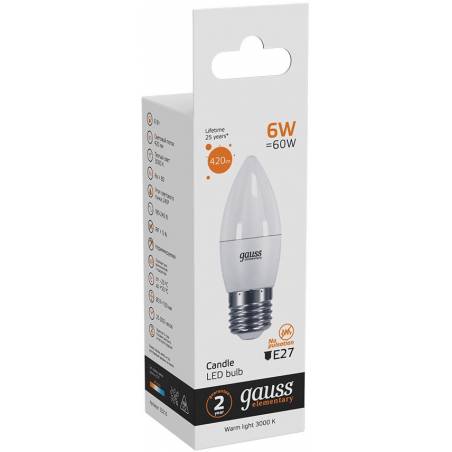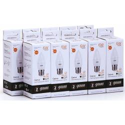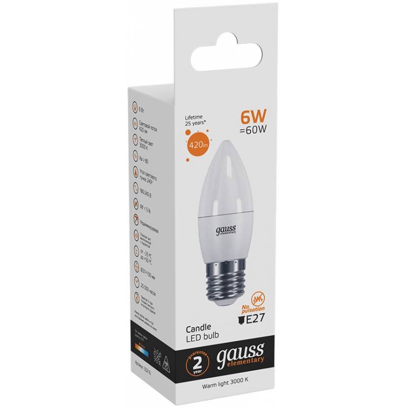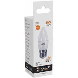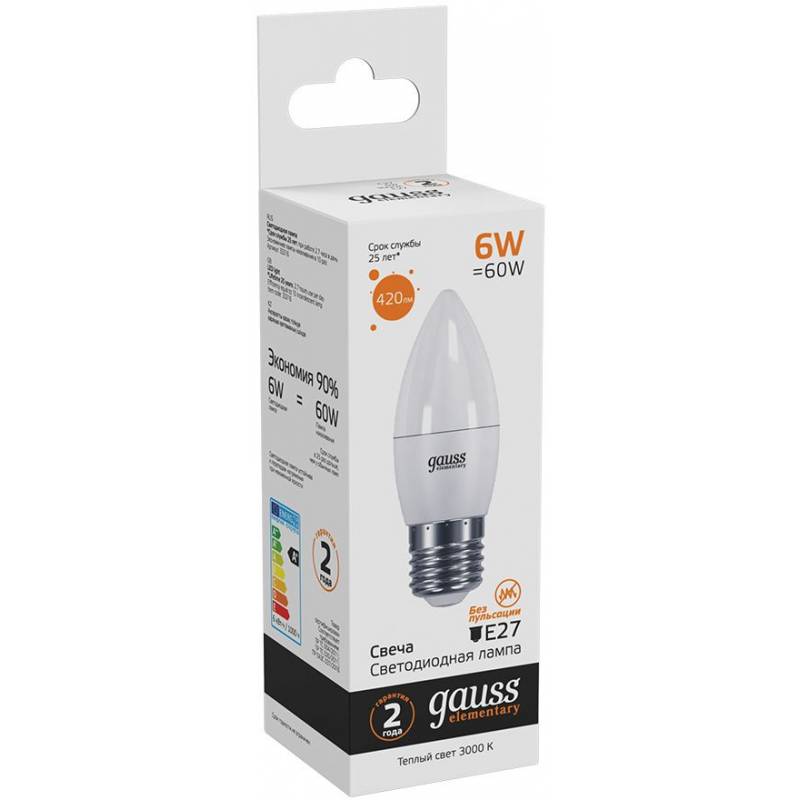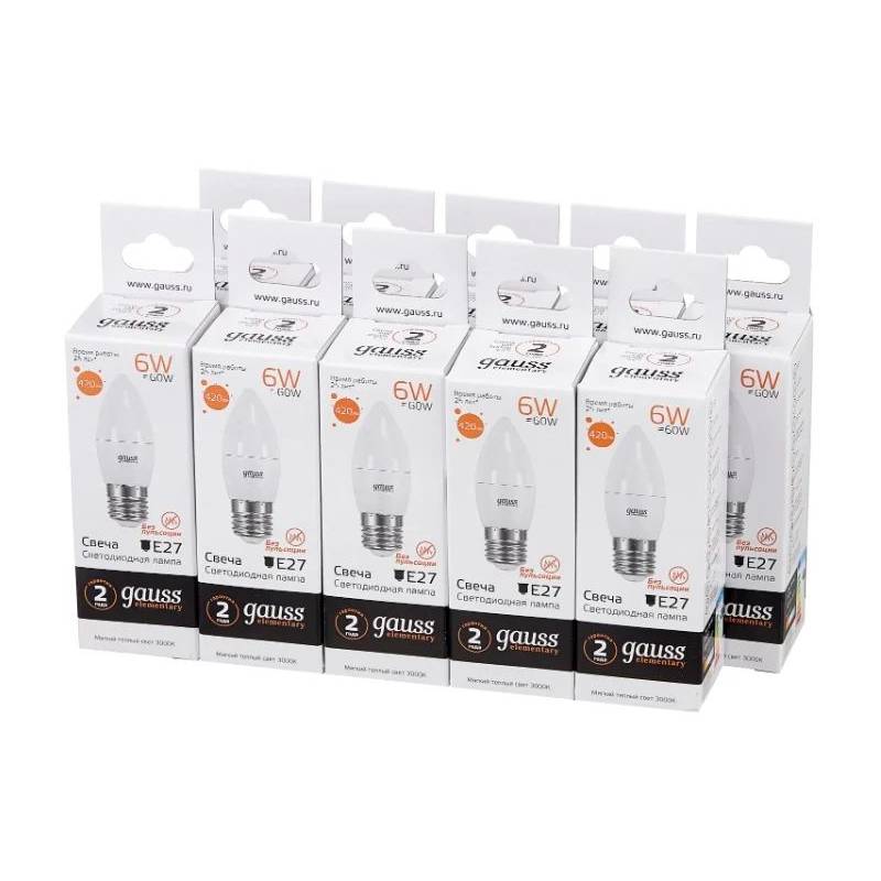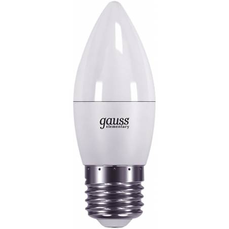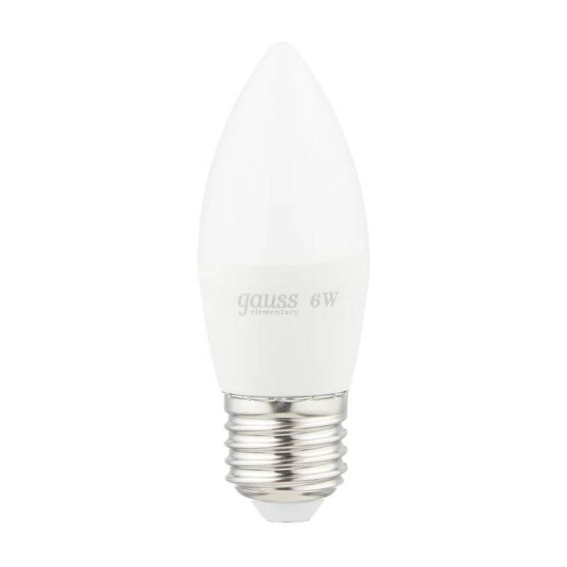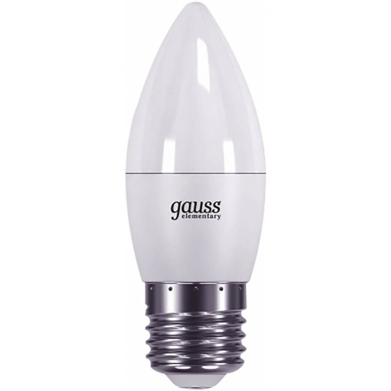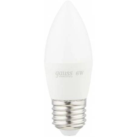 Лампа светодиодная Gauss Elementary 6Вт цок.:E27 свеча 220B 3000K св.свеч.бел.теп. C37 (упак.:10шт) (33216)