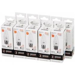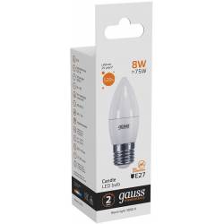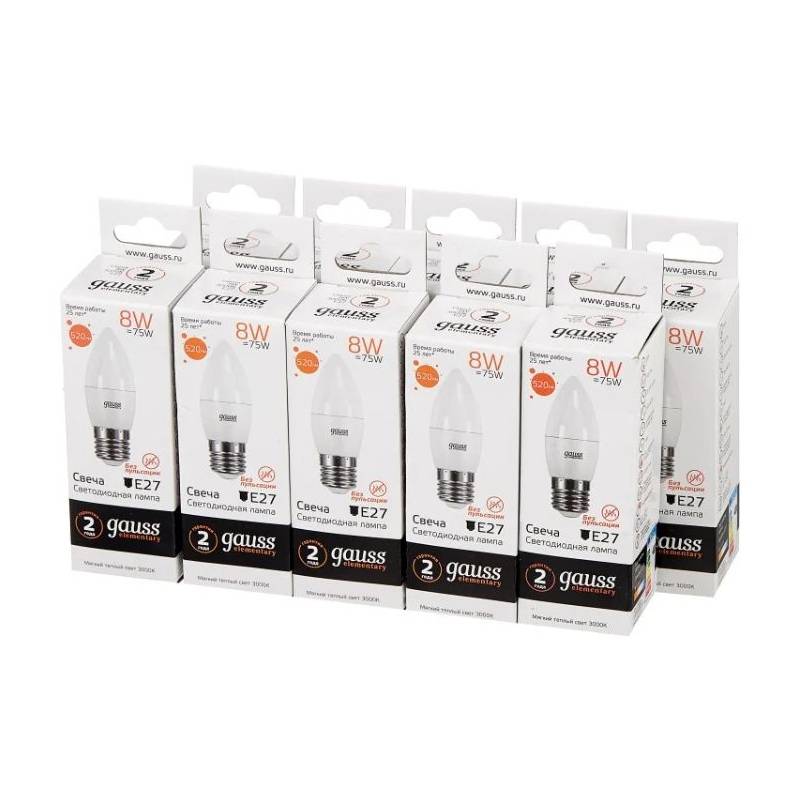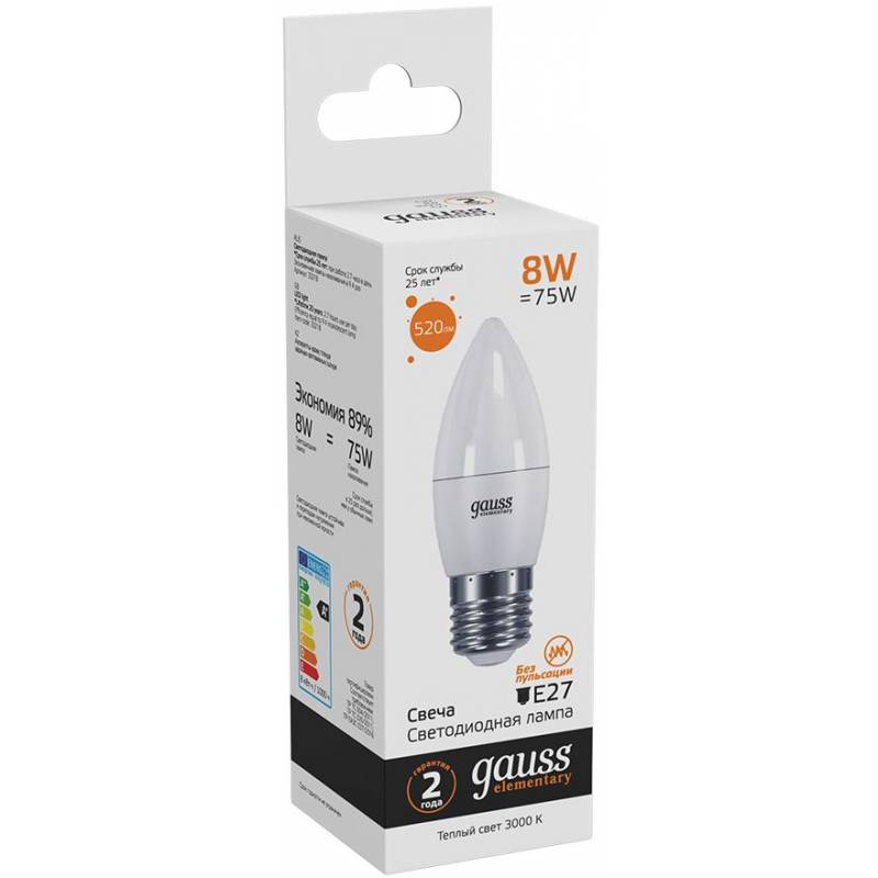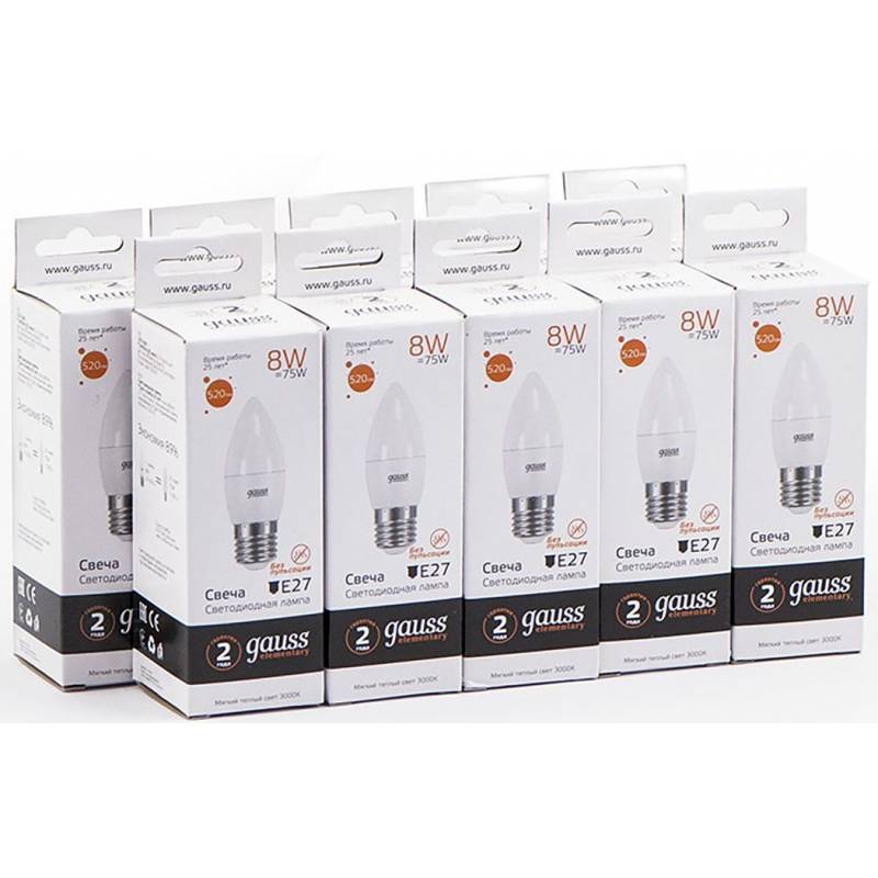 Лампа светодиодная Gauss Elementary 8Вт цок.:E27 свеча 220B 3000K св.свеч.бел.теп. C37 (упак.:10шт) (33218)